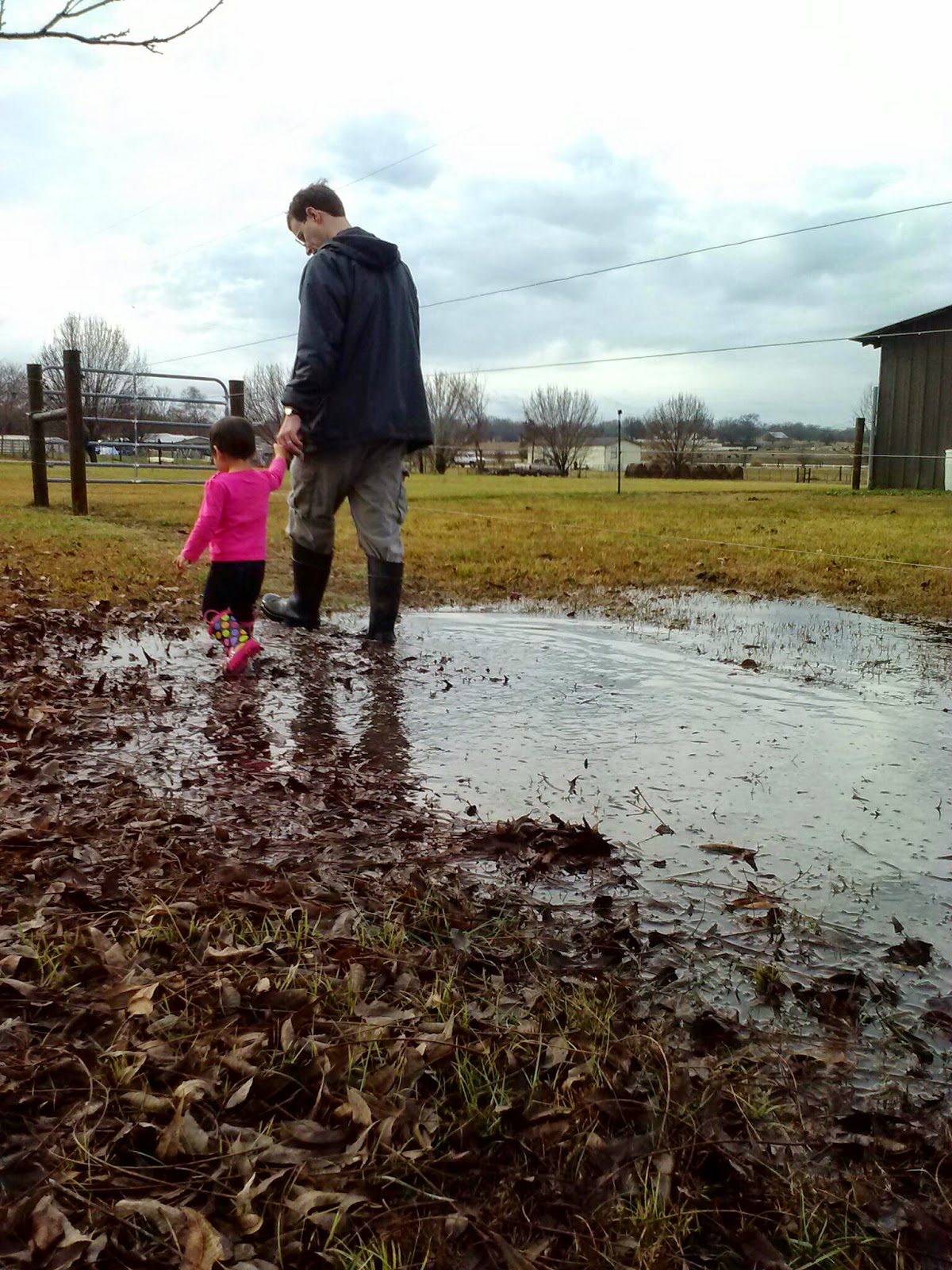 Papa walked them through this BIG puddle since it was near the electric fence (no casualties, yet, y'all. I think I've pointed to it and said "HOT" and "OUCH" and "NO" a miliion times!!).